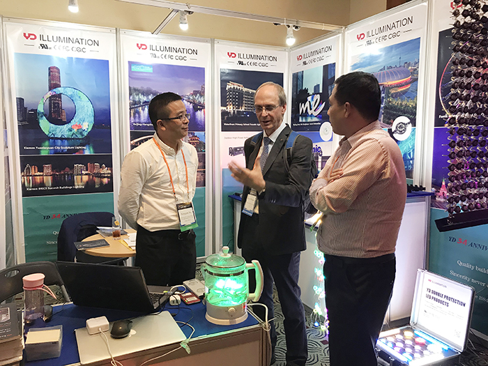 ▲ 展會期間,CIE主席Dr. Yoshi Ohno蒞臨勇電展位,充分肯定了勇電照明在行業(yè)內的發(fā)展地位,并對勇電的產(chǎn)品質量、技術升級、超過上萬個的工程項目給予了高度的認可和好評。